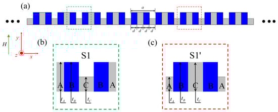 As shown in Figure 1a, the one-dimensional magnetoelastic phononic crystal slab under discussion consists of a stepped thin-plate structure formed by alternately combining magnetic Terfenol-D medium (dark blue) and non-magnetic pure tungsten medium (gray) with a horizontal thickness of d = 2 mm along the x-axis. Terfenol-D, as a smart material, exhibits magnetoresponsive characteristics, allowing its effective elastic modulus and other physical properties to be modulated by an external static magnetic field [40]. The model is designed with an infinite periodic arrangement along the x-direction within the x-y plane, while maintaining a finite height in the y-direction. The external static magnetic field H is applied along the y-axis. Since the z-axis of the system is non-periodic, it is assumed to be infinite by default. Figure 1b,c show two different unit cells with the same lattice constant . For the consideration of inversion symmetry in the unit cell, the media at different positions are labeled as A, B, and C. For the S1 unit cell, the heights are , and . For the S1’ unit cell, the heights are , .