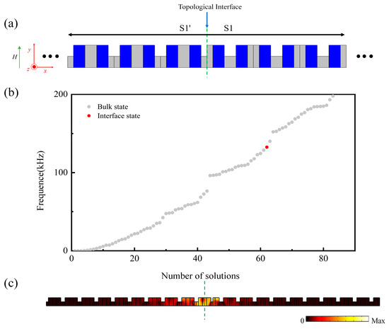 Analogous to electronic systems, for the elastic wave system formed by connecting the phononic crystal slabs S1 and S1’, which have different topological properties within their overlapping band gaps, an additional interface state emerges [33]. This interface state manifests as a high degree of localization and energy enhancement of elastic waves at the interface. To verify the existence of topological interface states within the Lamb waves system, mechanical free boundary conditions were applied to all upper and lower surfaces of the phononic crystal slab, and magnetic open boundary conditions were set on the surfaces of the magnetic medium. as shown in Figure 3a, we assemble a supercell by linking two one-dimensional magnetoelastic phononic crystal slabs, with each plate consisting of 10 S1’ and S1 unit cells. Figure 3b presents the eigenfrequency spectrum of the S1’ + S1 supercell under an external magnetic field of , clearly showing an additional eigenstate, indicated by a red dot, within the overlapping band gap of the second bands of S1 and S1’. Additionally, Figure 3c illustrates the eigendisplacement field distribution corresponding to this extra eigenstate at a frequency of within the S1’ + S1 supercell structure. It is evident that the displacement field peaks are predominantly localized at the interface marked by the green dashed line and decay rapidly towards both ends of the supercell. Thus, this additional eigenstate indeed exhibits the characteristics of a typical topological interface state in a one-dimensional periodic system.