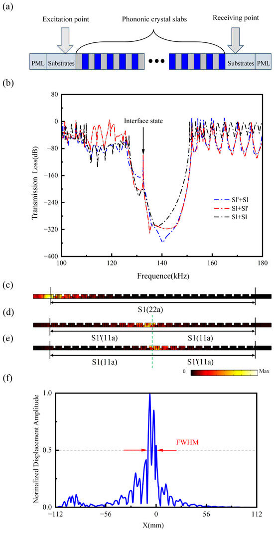 Through frequency domain analysis, we examined the displacement field distribution patterns in these three supercell structures at the interface state frequency . Figure 4c shows that no vibrational mode excited by the left excitation is produced in the S1 + S1 supercell structure. Instead, in the displacement fields of the S1’ + S1 and S1 + S1’ supercell structures shown in Figure 4d,e, the elastic energy in the system is clearly concentrated near the topological interface within the supercell structure. Due to the impedance mismatch at the interface, the energy concentration region is more biased towards the S1’ unit cell side. It is worth noting that further analysis of the energy concentration behavior of the topological interface state reveals that in Figure 4f, the normalized spatial distribution of the displacement amplitude along the central crossline (white dashed line) of the S1’ + S1 supercell structure is plotted. It can be seen that the full width at half maximum (FWHM) of the displacement field distribution corresponding to the topological interface state in the system is approximately 1.17a, further confirming the highly localized nature of the topological interface state.