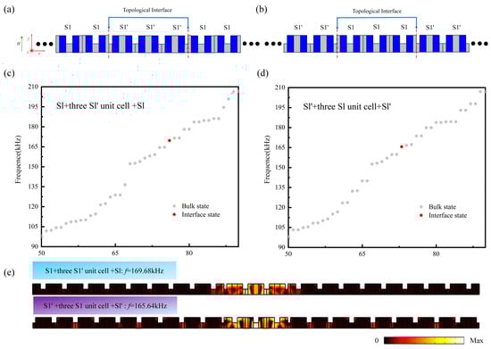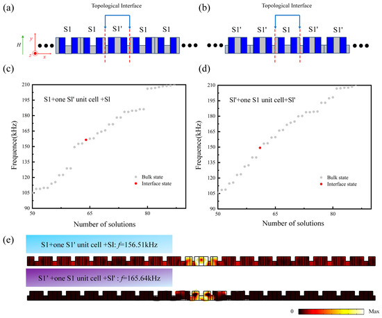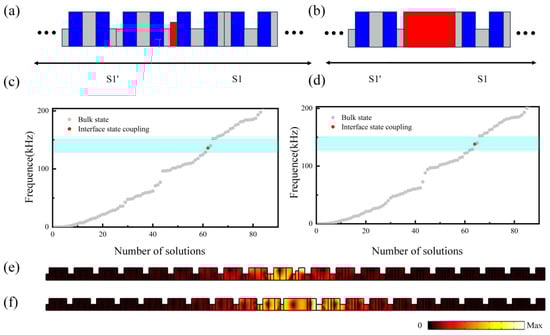 (a,b) Schematic diagram of the phononic crystal structures S1+ one S1’ unit cell + S1 and S1’ + one S1 unit cell + S1’. (c,d) Corresponding eigenfrequency spectra of the supercell structures S1 + one S1’ unit cell + S1 and S1’ + one S1 unit cell + S1’. (e) Interface coupling modes in the S1 + one S1’ unit cell + S1 and S1’+ one S1 unit cell + S1’ supercell structures.