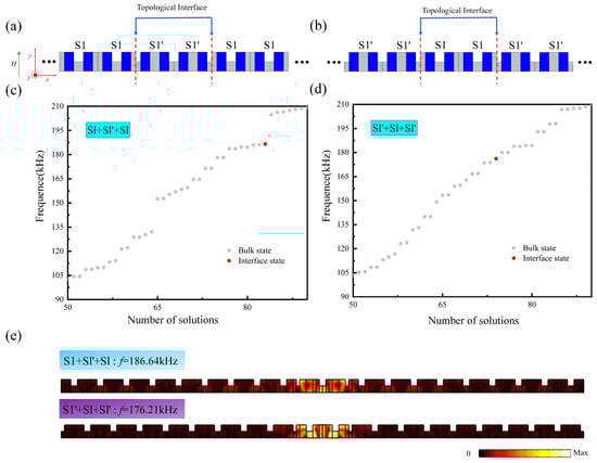 (a,b) Schematic diagram of the phononic crystal structures S1 + S1’ + S1 and S1’ + S1 + S1’. (c,d) Corresponding eigenfrequency spectra of the supercell structures S1 + S1’ + S1 and S1’ + S1 + S1’; (e) Interface coupling modes in the S1 + S1’ + S1 and S1’ + S1 + S1’ supercell structures.