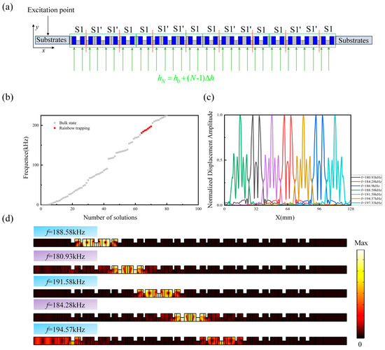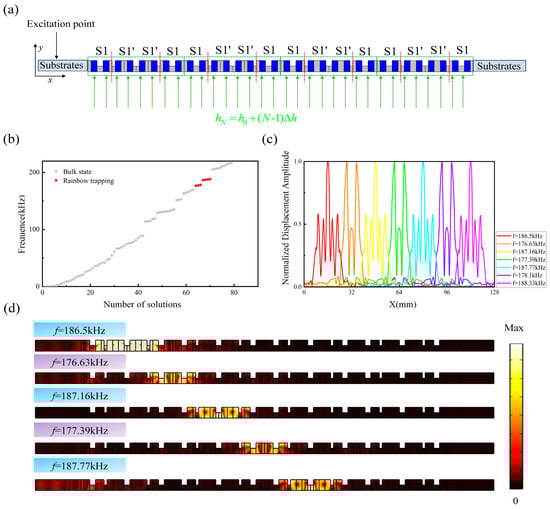 To verify that the supercell structure possesses seven topological rainbow states, a study of the eigenfrequencies of the phononic crystal slab supercell structure for N = 4 is conducted in COMSOL Multiphysics software. The initial components of the gradient magnetic field Hg are set to and . Figure 10b shows the calculated eigenfrequency spectrum of the aforementioned structure, where the seven rainbow states marked by red dots are clearly visible. Figure 10c depicts the normalized distribution of the corresponding eigendisplacement field amplitudes along the x-axis. It can be clearly seen that rainbow states of different frequencies are highly localized at different spatial positions in the phononic crystal slab, with a full width at half maximum (FWHM) of approximately 2a, and there is almost no overlap between the rainbow states. Subsequently, further full-wave simulations were performed to validate the N = 4 supercell structure, with low-reflective boundary conditions applied at the outermost boundaries to absorb the elastic waves reflected from the ends. Figure 10d shows the steady-state displacement field distribution of the phononic crystal slab supercell structure for excitation frequencies of 176.63 kHz, 177.39 kHz, 186.5 kHz, 187.16 kHz, and 187.77 kHz. It can be seen that the simulation results are consistent with the corresponding eigenfield distributions mentioned above. Specifically, incident elastic waves of different frequency components are almost completely separated and captured between the different topological interfaces of the alternating SSH structure phononic crystal slab along the x-axis, with the corresponding displacement fields being highly localized. Here, the mechanism for the generation of the localized rainbow states in the phononic crystal slab system of the rainbow supercell can be explained based on the modal coupling between adjacent topological interface states discussed in the aforementioned S1-S1’-S1 and S1’-S1-S1’ supercell structures.