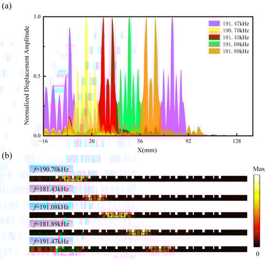 To demonstrate the tunability of our system, we subsequently reconstruct the gradient external magnetic field Hg to regulate the frequencies of the aforementioned rainbow states within the structure, while keeping the initial components and unchanged. Figure 11a,b present the spatial distribution of the normalized amplitude values after reconstruction, as well as the steady-state displacement fields of the associated rainbow states. It is evident that through contactless tuning of the external magnetic field, the captured rainbow states remain highly localized, but their operating frequencies can be modulated. The frequencies of the five new rainbow states are 181.43 kHz, 181.89 kHz, 190.7 kHz, 191.08 kHz, and 191.47 kHz, respectively. Therefore, compared to traditional gradient metamaterials [19,27,28,29], the one-dimensional topological rainbow system we propose exhibits significant features of high localization, compact structure, and wide frequency tunability, holding great potential in the design of compact energy harvesters in elastic wave systems.