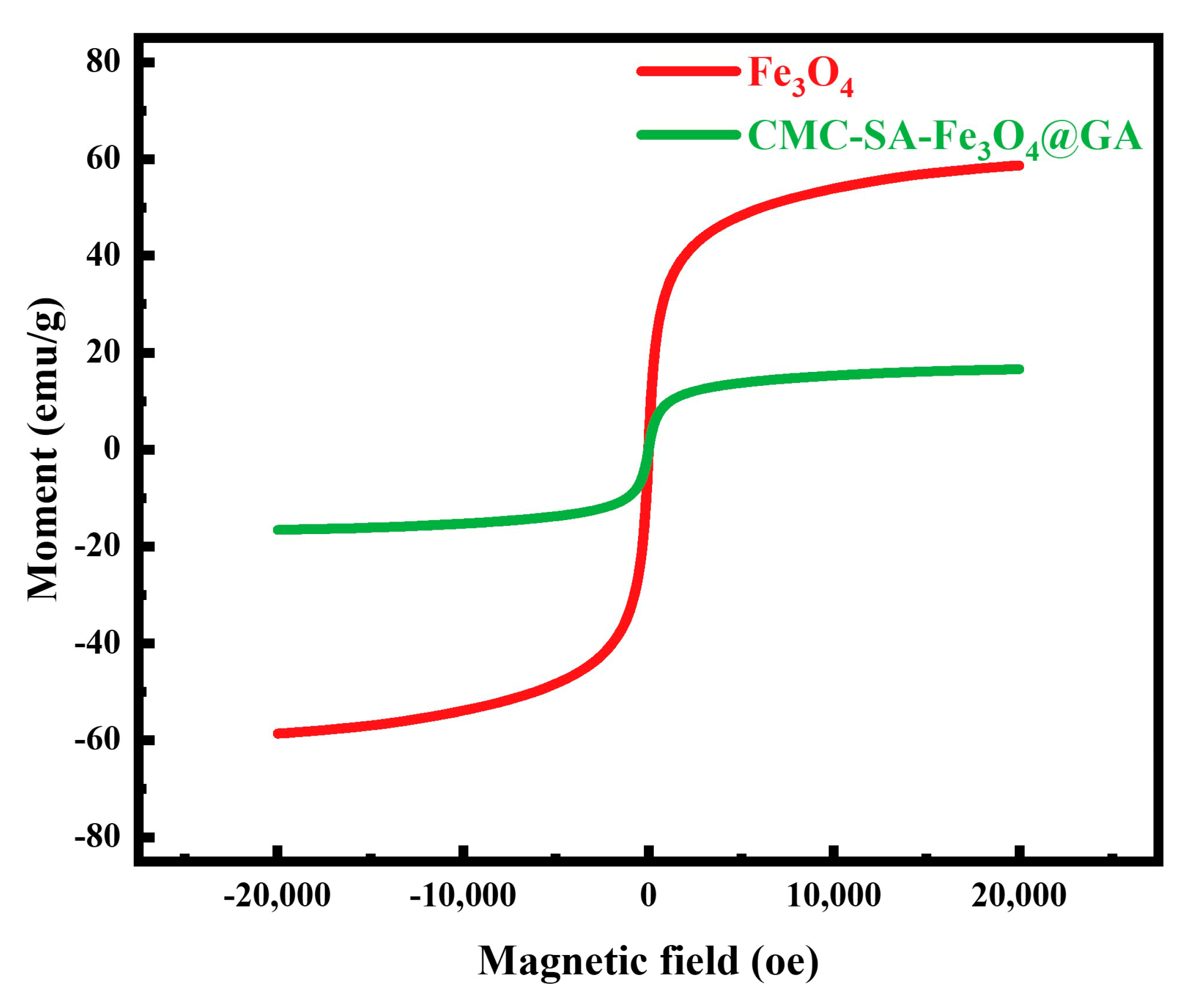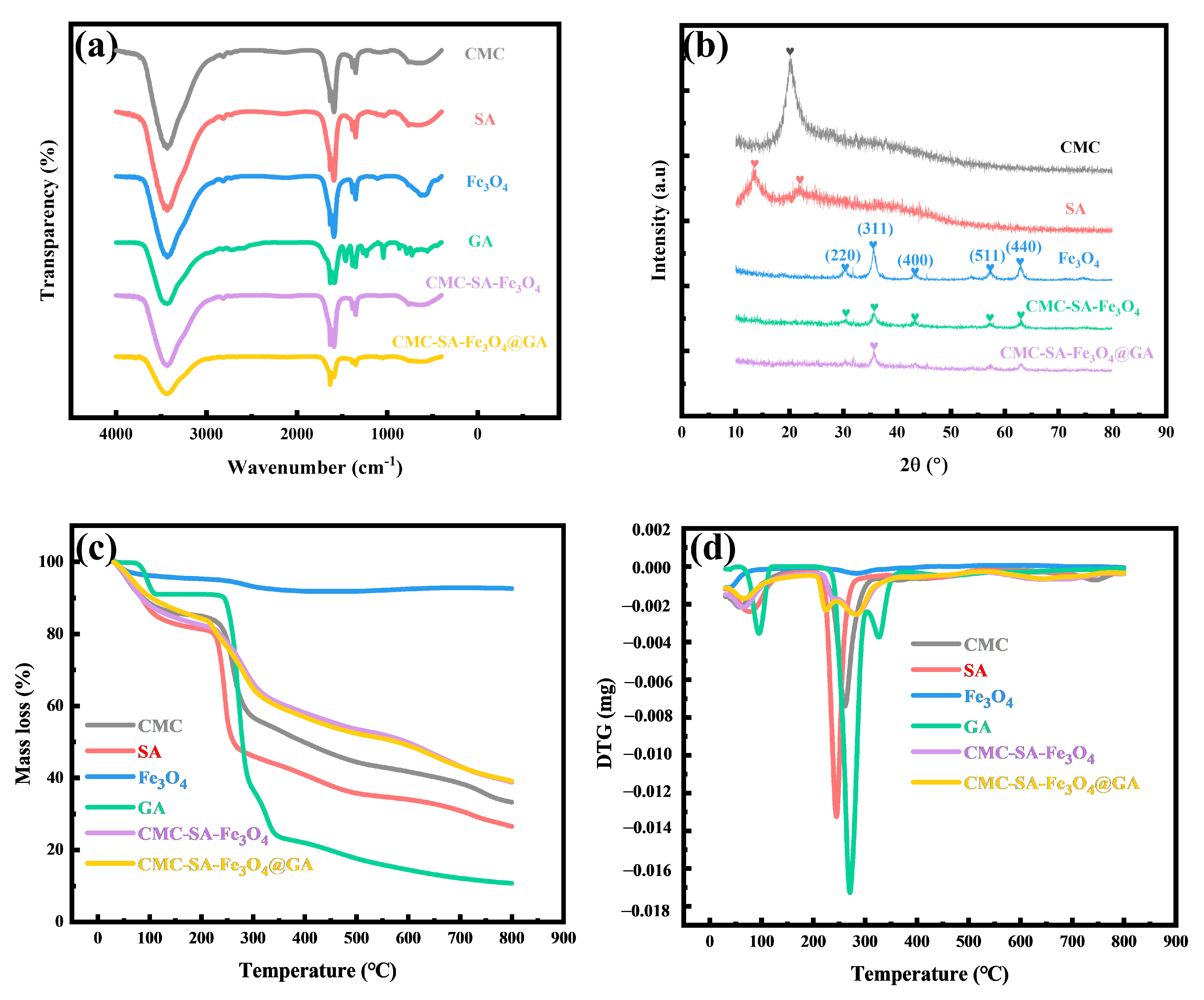 2.2. Construction of CMC-SA-Fe3O4@GA Hydrogel Beads