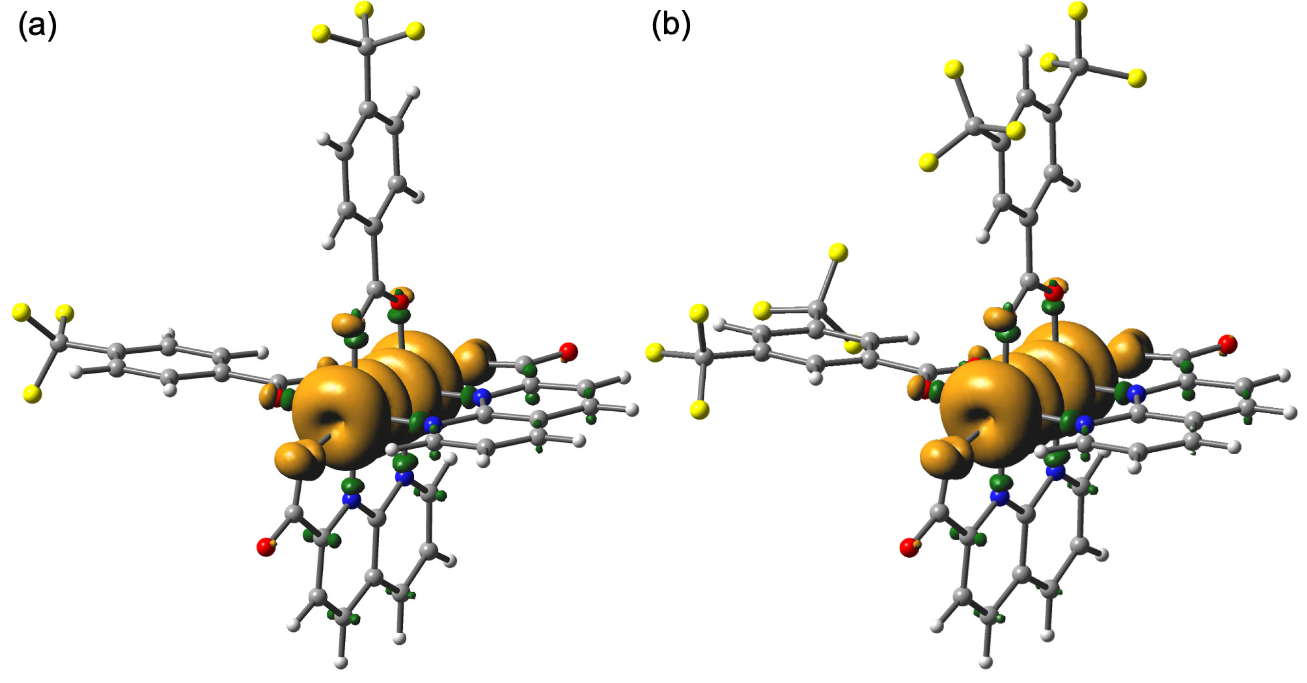 3.4. Optimized Geometries, Spin Density Distributions, and Electronic Structures