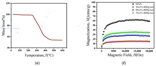 As indicated in Figure 2c, the particles are composed of Fe, Zn, and O elements, suggesting that Zn2+ has been doped into the ferrite particles. From Figure 2d, the diffraction peaks at 1238.1 cm−1, 1134.0 cm−1, and 1307.5 cm−1 indicate the presence of C–F, –CF2, and –CF3 functional groups in the sample, respectively. The diffraction peak at 983.5 cm−1 confirms the existence of the C–O–C functional group. The diffraction peak for the C=O bond in PFPE acids is located at 1777.3 cm−1. After coating, this peak shifts to 1685.5 cm−1. This shift is caused by the chemical adsorption between the COOH group and the iron ions on the particle surface, confirming that PFPE acid is coated via chemical bonds [35]. As shown in Figure 2e, the mass of the sample decreases gradually with increasing temperature. When the temperature is lower than 280 °C, the mass reduction is slight, which is attributed to the evaporation of a small amount of water. In the temperature range of 280–480 °C, the particles undergo a mass loss of approximately 45 wt.%, resulting from the decomposition of PFPE acids coated on the particle surface. As the temperature continues to rise to 600 °C, no further change in the particle mass is observed [36]. From Figure 2f, it can be seen that with the increase in magnetic field strength, the saturation magnetization of the particles initially increases rapidly and then saturates. The magnetization curve of the particles shows that their specific saturation magnetization is 61.93 emu/g [23]. The magnetization curves of the ferrofluids are similar to that of the particles; the specific saturation magnetizations of the three ferrofluids (50 wt.%-4600 g/mol, 60 wt.%-4600 g/mol and 70 wt.%-4600 g/mol) are 15.47 emu/g, 28.40 emu/g and 35.52 emu/g, respectively.