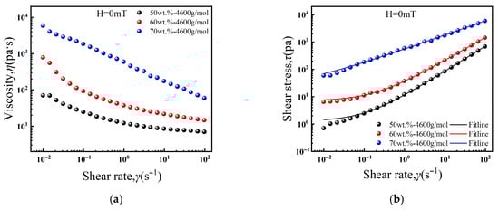 Effect of molecular weight of carrier liquid on rheological properties of ferrofluids under zero magnetic field: (a) viscosity curves, (b) shear stress curves and H-B model fitting curves.