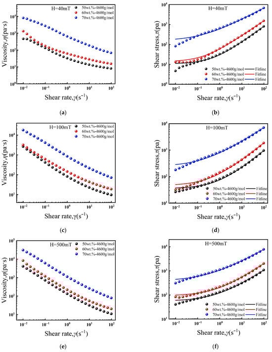 Effect of particle concentration on rheological properties of ferrofluids under magnetic field: (a) viscosity curves (40 mT), (b) shear stress curve (40 mT) and H-B fitting curves, (c) viscosity curves (100 mT), (d) shear stress curve (100 mT) and H-B fitting curves, (e) viscosity curves (500 mT), (f) shear stress curve (500 mT) and H-B fitting curves.
