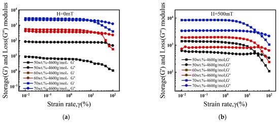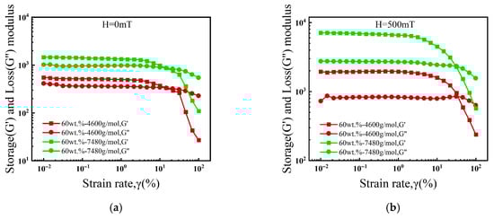 Strain sweep curves of ferrofluids prepared with carrier liquids of different molecular weights: (a) 0 mT, (b) 500 mT.