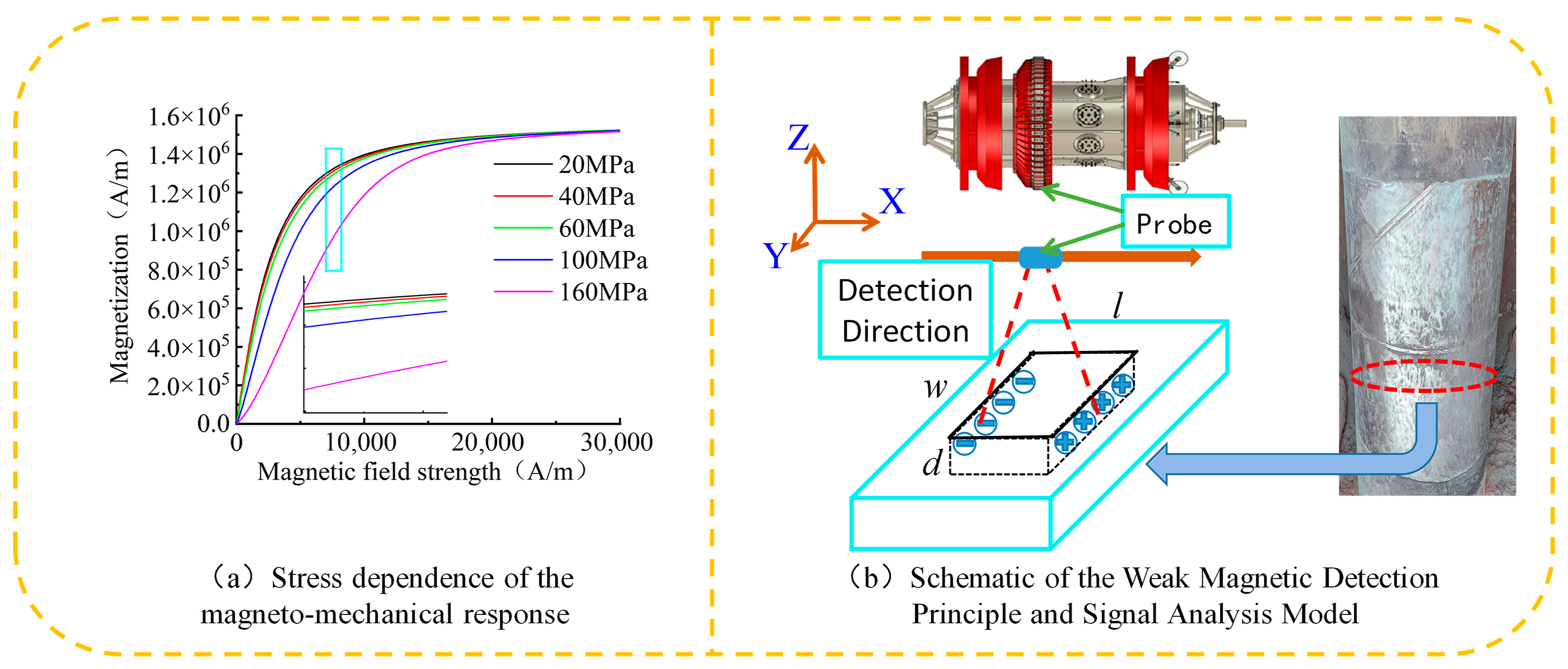 - A stress-dependent magneto–mechanical coupling model is developed by introducing an equivalent stress-induced field into the excitation and hysteretic magnetization processes. The resulting M(H, σ) curves under different excitation intensities form the basis for analyzing stress-related weak-magnetic signals.