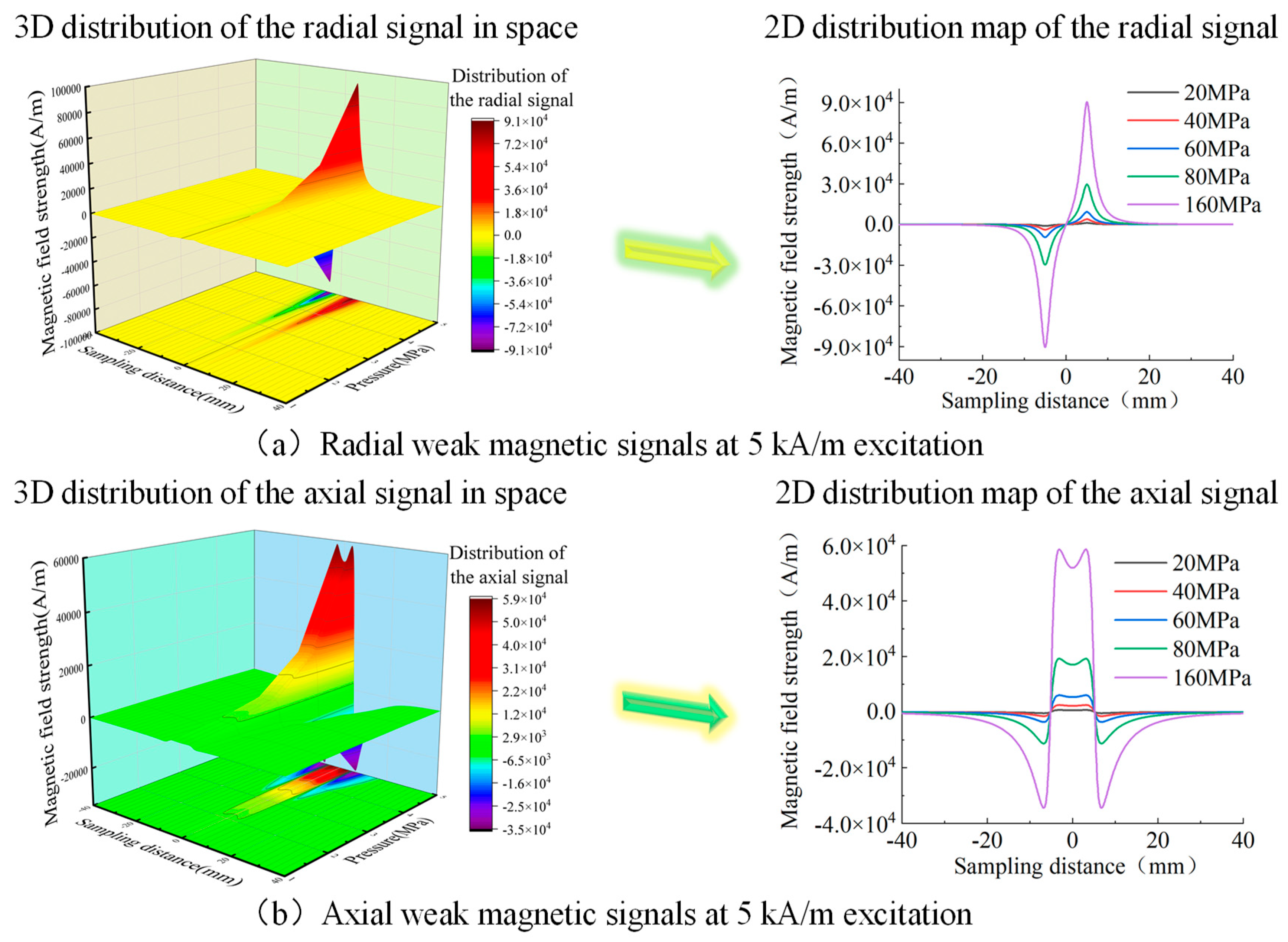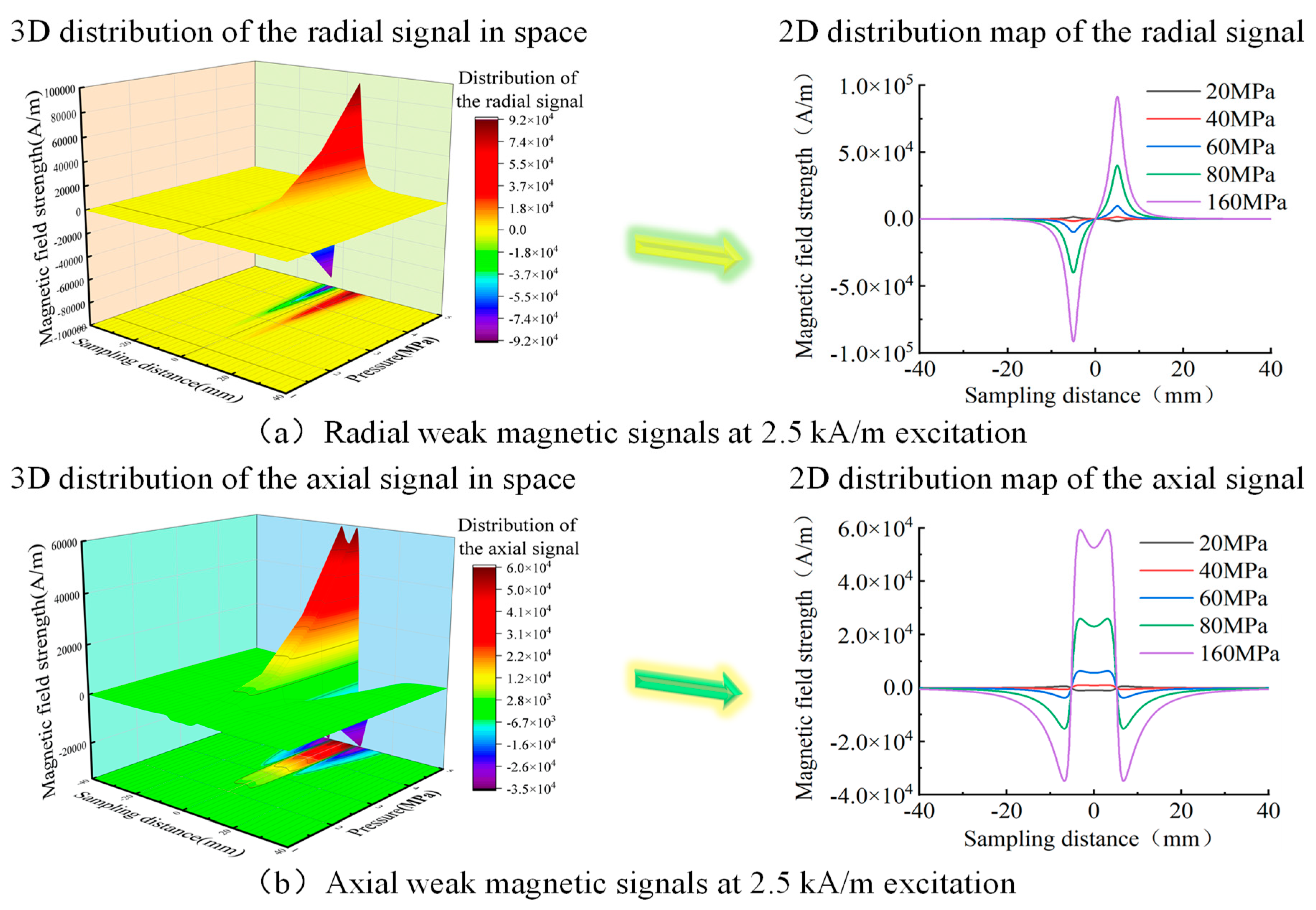 - An analytical weak-magnetic field model for stress-concentrated regions is established. By modeling the stressed zone as a cuboid with stress-dependent equivalent magnetic charge density, explicit tangential and normal field expressions are obtained, enabling analytical mapping from stress level to signal features.