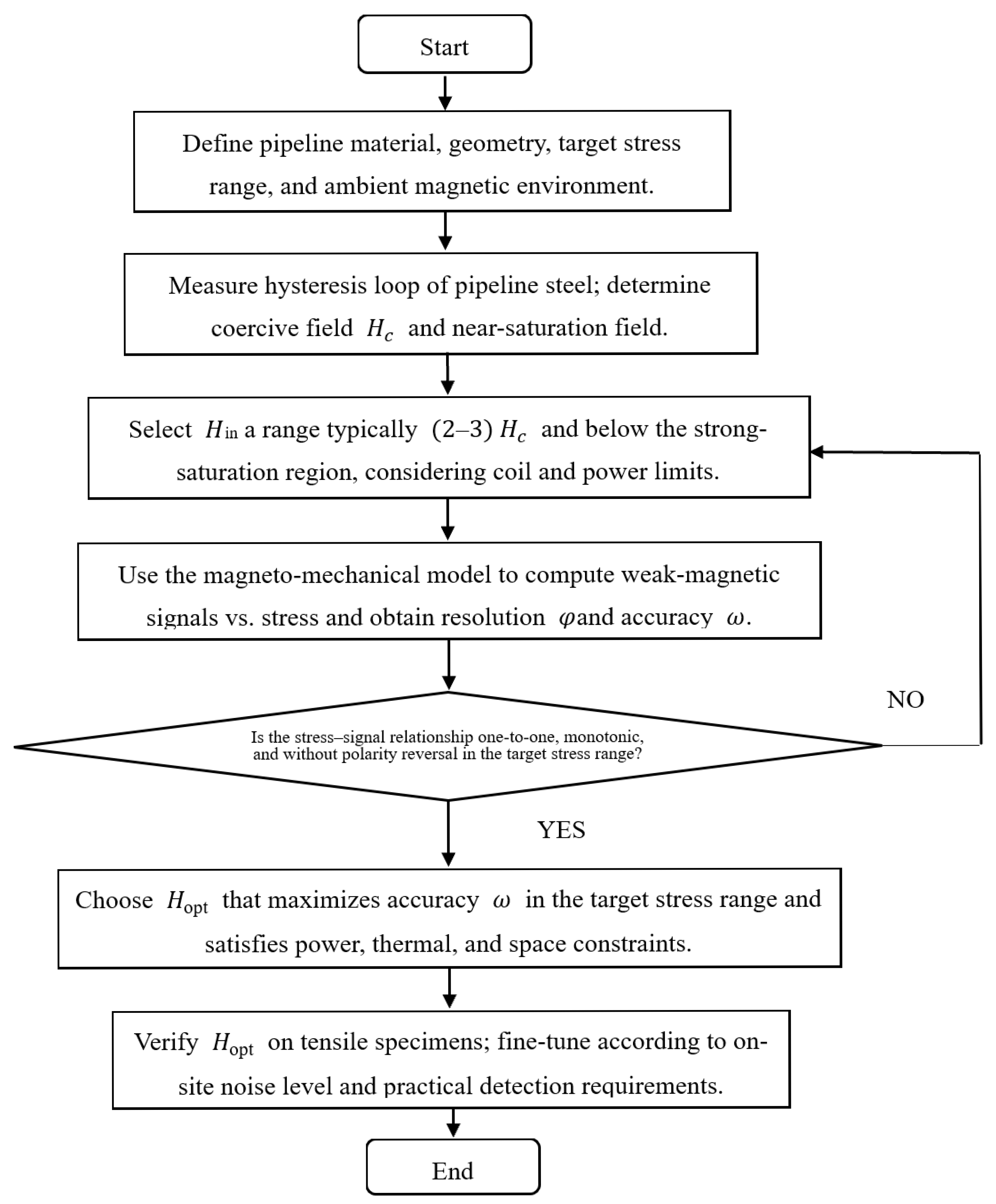 - Set a candidate excitation interval. Select a preliminary excitation interval in which the applied magnetic field is typically 2–3 times the coercive field to overcome magnetic history effects, while remaining below the strong-saturation region so that the stress-dependent magnetization maintains sufficient sensitivity.