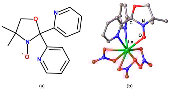 (a) Tridentate oxazolidine radical, (Rad): 4,4-dimethyl-2,2-bis(pyridin-2-yl)-1,3-oxazolidine-3-oxyl.; (b) molecular structure of [LnRad(NO3)3], hydrogen atoms are omitted for clarity.