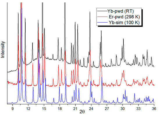 As established in previous studies of single-crystal and powder RXD of the series complexes [LnRad(NO3)3] (Ln = Gd, Dy, Tb, Tm, Y, Eu, and Lu), all complexes in this series are isostructural [7]. Powder diffractograms indicate that complexes 1 and 2 are isostructural with their congeners (Figure 2). The crystal cell parameters for 1 and 2, along with the SCXRD experimental details, are delineated in Table S1.