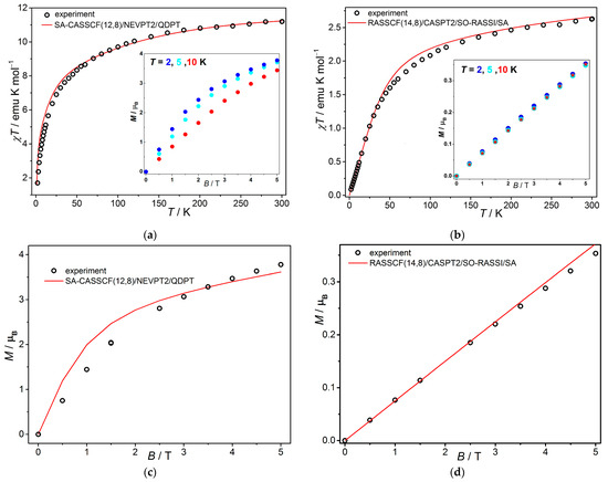 The calculated temperature dependences (red lines in Figure 3a,c) of the magnetic molecular susceptibility show reliable coincidence with the experiment data for both complexes. In the case of 2, the calculated magnetization curve reproduces well the experimental one (Figure 3d). The magnetization of 1 displays a slight divergence between the theoretical and experimental plots, with the calculated curve exhibiting a quicker saturation exit. This discrepancy can be attributed to the disparity in the methodologies employed for the dynamic correlation account, namely NEVPT2 for the Er complex and XMS–CASPT2 for the Yb one. The NEVPT2 procedure addresses exclusively the contributions to the energy of the considered states, whereas XMS–CASPT2 additionally considers the interaction between the states of specific multiplicity and the perturbation of the initial RASSCF wavefunctions, yielding a novel set of state energies and corresponding wavefunctions (See Supplementary Materials). Therefore, in the case of ytterbium, there are more hidden correlations considered within the XMS–CASPT2 framework, leading to the better reproduction of the experimental data. In the case of complex 1, the XMS-CASPT2 approach was not employed due to the substantial computational demands associated with the extensive number of states. The NEVPT2 calculations were deemed the more reliable approach. More details about all calculations employed in the case of erbium and ytterbium complexes can be found at the end of Supplementary Materials.