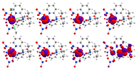 The natural charge distributions (NCDs) of the ground triplet and ground singlet states of 1 and 2 (see Figures S1 and S2) are nearly identical for both complexes. The charges on the Er and Yb ions are 1.5 and 1.7, which is consistent with the DFT calculation results for Ln(III) complexes in general. The charge distribution on the donor atoms exhibits a negative character, with values approaching −0.5 on nitrate oxygens and −0.45 on pyridyl nitrogens. Notably, lower values are observed on the oxygen atom of the nitroxyl moiety of the radical, with estimates of −0.37 and −0.31 for 1 and 2, respectively. This distribution leads to the formation of a relatively strong crystal field.