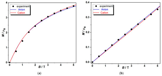 M vs. B plot of 1 (a) and 2 (b). The symbols are the experimental points, while the blue and red solid lines represent the best simulation using the g and J parameters reported in Table 3.