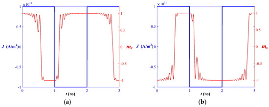 The magnetization of the free layer varies with the polarity of the current density. From (a) to (b), the magnetization of the fixed layer is in the +x-axis and −x-axis directions, respectively.