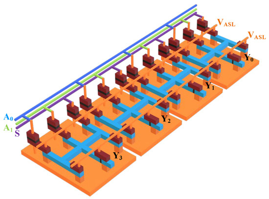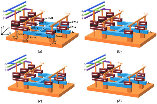 Based on the above description, Figure 5 shows the local layouts of Y0 to Y3, where each local layout is a 5-input minority gate with an SISM structure. FM1, FM2, and FM3 are both the free layers of the MTJ and the inputs of the 5-input minority gate. Their magnetization directions are determined by the input signals S, A1, and A0, respectively. FM4 and FM5 are the inputs of the minority gate, and their magnetizations are fixed to the +x axis direction, representing input logic 1. FM6 is the output of the minority gate, and its magnetization direction is determined by the magnetization direction of the five inputs. When a positive voltage VASL is applied, the 3-input NOR logic function shown in Equation (2) can be realized.