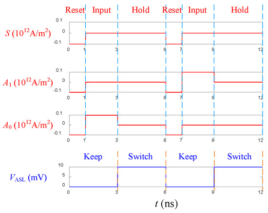 During 1~3 ns, the input signals are in the “Input” phase, the current density of S and A1 is 0, and the current density of A0 is 1 × 1011 A/m2, so that m1x and m2x remain basically unchanged at −1, while m3x rotates from +1 to −1. At this time, the operating voltage is still in the “Keep” phase, and m4x, m5x, and m6x remain unchanged.