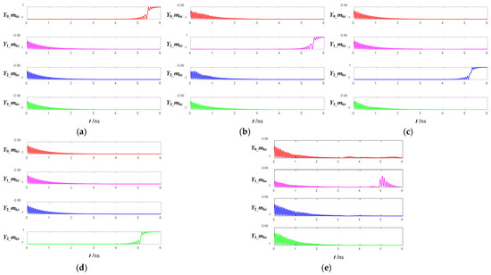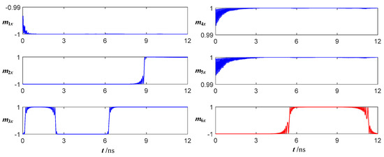 Suppose that the initial magnetization directions of FM4 and FM5 are both + x axis, and the initial magnetization directions of the other FMs are all −x axis. Figure 9 shows the time evolution of magnetization in the x-direction of the 2–4 decoder under the signals shown in Figure 8. Due to space limitations, Figure 9 shows only the time evolution of the x-direction magnetization of six FMs in Y1 (Figure 5b). Assume that when the x-direction magnetization is 1, it means logic 1, and when it is −1, it means logic 0.