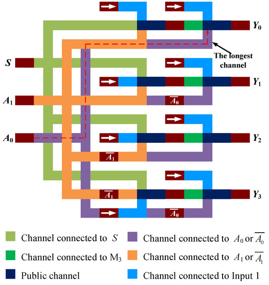 According to Equation (11), the 2D schematic diagram of the second decoder is shown in Figure 11. To avoid the crossover of channels, the three inputs are not in the same plane. The channel connected to A1 is in the top layer, A0 is in the middle layer, and S is in the bottom layer. The white arrow indicates that the input FM of the three-input minority gate is magnetized in the +x-axis direction, representing logic 1.