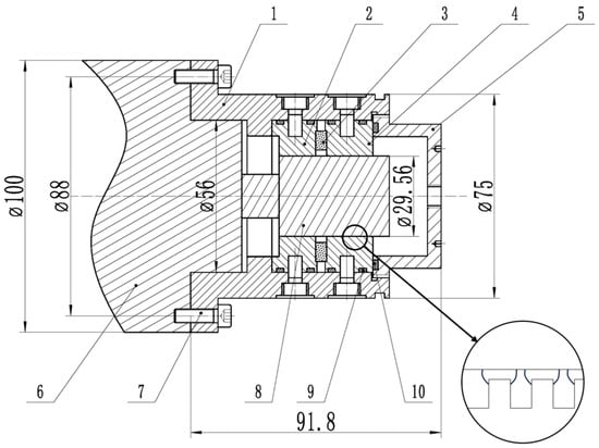 Electric Spindle Motor: A 4 kW high-speed electric spindle motor (model: 1000MD60Y4; manufacturer: Guangzhou Haozhi Industrial Co., Ltd., Guangzhou, China) was used to drive the rotating shaft. The motor had a maximum rotational speed of 60,000 rpm and a rated power of 4 kW. The motor’s stator was water-cooled, and the shaft was made of 45 steel with a diameter of 25 mm. The motor was powered by a 350 V DC power supply and had a rated current of 10 A at a frequency of 1000 Hz. The motor’s flange was directly connected to the seal device.