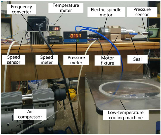 Low-Temperature Circulating Machine: A YKKY DX-1000 low-temperature circulating machine (manufacturer: Beijing Yuankangyu Technology Co., Ltd., Beijing, China) was used to provide cooling for the motor and the seal device. The cooling medium was ethylene glycol with a 50% concentration, and it was circulated through the cooling channels using a centrifugal pump inside the machine. The machine had a temperature control range of −20 to 30 °C with a control accuracy of ±0.3 °C and a cooling power of 1000 W. The coolant flow rate was maintained at 2 L/min.