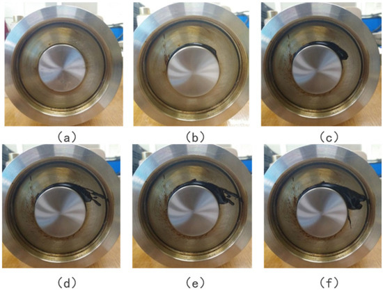 Pressure System: An air compressor (model: AC-24; manufacturer: Shanghai Gison Machinery Co., Ltd., Shanghai, China) was used to pressurize the seal chamber. A pressure regulator (model: 3400; manufacturer: Swagelok, Solon, OH, USA) was used to control the pressure with an accuracy of ±0.002 MPa. A pressure sensor (model: PCM300; manufacturer: Nanjing Wotian Technology Co., Ltd., Nanjing, China, range: 0–1.0 MPa) was used to measure the pressure. The pressure sensor had an accuracy of ±0.25% FS. The pressurized air was introduced into the sealed chamber through a port on the end cap.