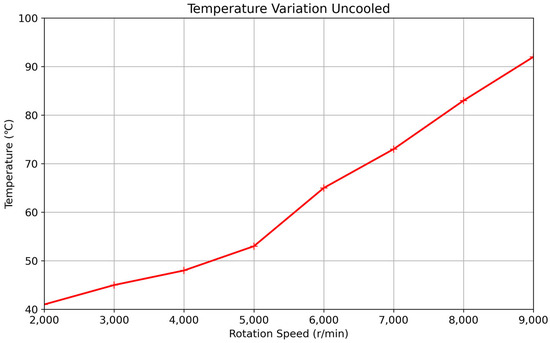 Uncooled Temperature Rise Tests: In the uncooled tests, the seal device was operated without any external cooling. The temperature at the sealing gap was measured at various rotational speeds ranging from 5000 rpm to 9000 rpm. The rotational speed was gradually increased, and at each set point, the system was allowed to reach a steady state before recording the temperature. The temperature was considered to have reached a steady state when the temperature change at the sealing gap was less than 0.1 °C per minute over a 5 min period. Each test was repeated three times, and the average temperature at each rotational speed was recorded. The temperature sensor was inserted into the seal gap, ensuring direct contact with the magnetic fluid.
