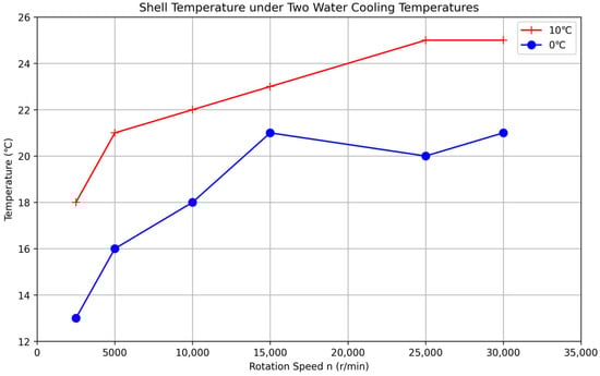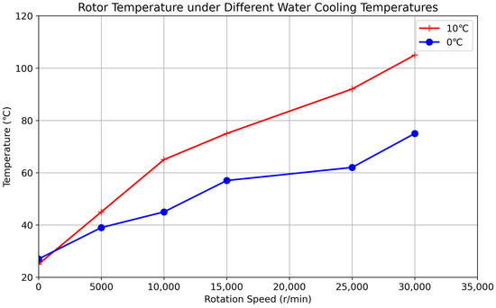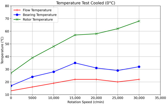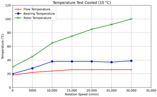 Cooled Temperature Rise Tests: The cooled temperature rise tests were conducted using the low-temperature circulating machine to provide cooling for the seal device and the electric spindle motor. Two different cooling temperatures were used: 10 °C and 0 °C. At each cooling temperature, the temperatures at the outer casing, pole pieces, and rotating shaft were measured at various rotational speeds ranging from 5000 rpm to 30,000 rpm. The rotational speed was gradually increased, and at each set point, the system was allowed to reach a steady state before recording the temperatures. The steady-state criterion was the same as in the uncooled tests (temperature change less than 0.1 °C per minute over 5 min). Each test was repeated three times, and the average temperature at each rotational speed and cooling temperature was recorded. The thermocouples were attached to the outer casing, pole pieces, and rotating shaft using thermally conductive paste to ensure good thermal contact.