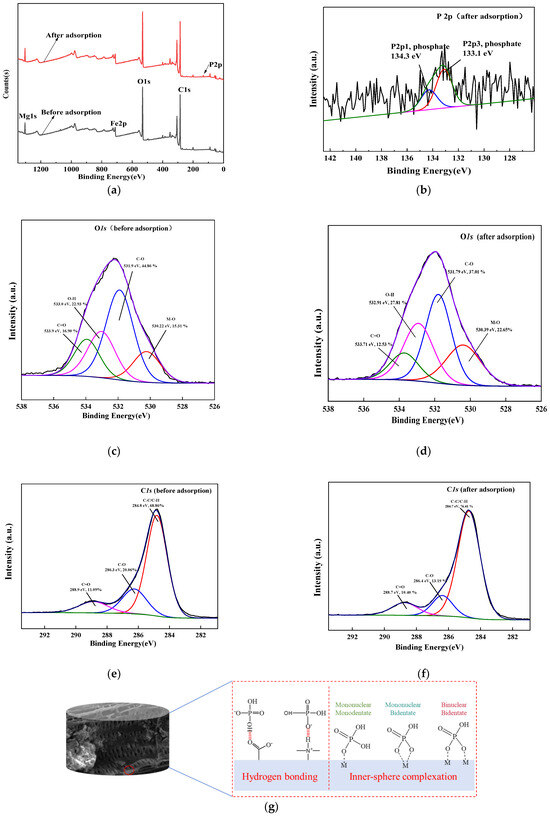 X-ray photoelectron spectroscopy analysis reveals critical interfacial interactions governing phosphate adsorption on the composite material. Full-scan spectra (Figure 3a) demonstrate the emergence of a distinct P 2p peak at 133.8 eV post-adsorption, with high-resolution deconvolution resolving dual components at 134.3 eV (P 2p1/2) and 133.1 eV (P 2p3/2) (Figure 3b), confirming successful phosphorus uptake. The O 1s spectra evolution (Figure 3c,d) shows a 12.1% decrease in oxygen functionalities associated with C=O (16.90%→12.53%) and C–O (44.86%→37.01%) groups, concurrent with a 21.3% increase in O–H content (22.93%→27.81%) and 47.9% enhancement in metal-oxygen bonds (15.31%→22.65%). These shifts indicate that carboxyl group deprotonation facilitates hydrogen bonding with phosphate while metal (hydro)oxide surfaces participate in inner-sphere complexation. Complementary C 1s analysis (Figure 3e,f) verifies surface chemistry restructuring, with oxygen-containing carbon moieties decreasing by 6.2% (C=O) and 34.2% (C–O), consistent with ligand exchange processes. The collective spectral evidence supports multiple coordination modes between phosphate and metal centers, including monodentate (Fe/Mg–O–PO3) and bidentate (Fe/Mg–O–PO2–O–Fe/Mg) configurations, mediated through combined hydrogen bonding and chemical complexation mechanisms. The proposed selective adsorption mechanism is illustrated in Figure 3g.