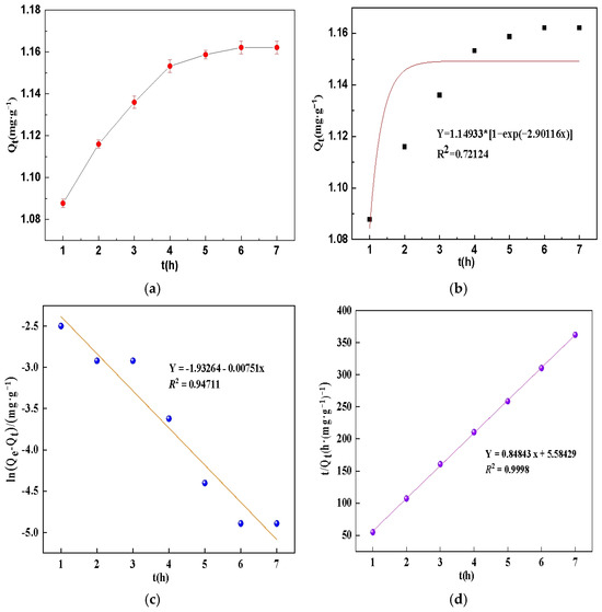 Adsorption kinetics of phosphate on CA composite: (a) Effect of contact time on phosphate adsorption capacity; (b) Nonlinear-pseudo-first-order kinetic model fitting (R2 = 0.72124); (c) Linear -pseudo-first-order kinetic model fitting (R2 = 0.94711); (d) Pseudo-second-order kinetic model fitting (R2 = 0.9998). Data points represent experimental measurements while solid lines indicate model predictions.