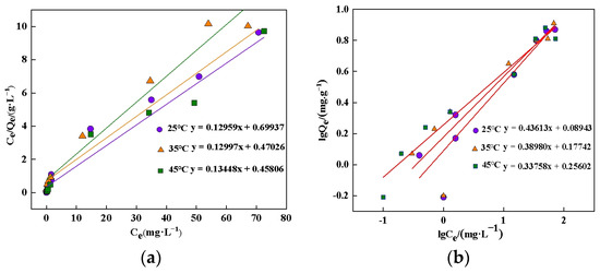 Equilibrium adsorption isotherm analysis of phosphate on CA composite at different temperatures (25 °C, 35 °C, and 45 °C): (a) Langmuir isotherm linear plots showing Ce/Qe versus Ce with corresponding linear equations; (b) Freundlich isotherm linear plots displaying lgQe versus lgCe with fitted linear equations.