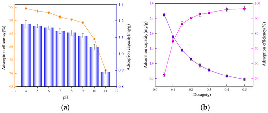 The influence of solution pH and adsorbent dosage on phosphate removal efficiency was systematically investigated. Under controlled conditions (5 mg·L−1 initial phosphate concentration, 0.2 g CA dosage, 25 °C, 175 rpm agitation for 240 min), pH exhibited a marked effect on adsorption performance (Figure 7a). The phosphate removal efficiency decreased progressively with increasing pH, from 94.56% (corresponding to 1.18 mg g−1 adsorption capacity) at pH 4 to 71.26% (0.89 mg g−1) at pH 11. This pH-dependent behavior can be attributed to the speciation of phosphate ions and surface charge characteristics of the adsorbent. In acidic conditions (pH 4–7), phosphate predominantly exists as H2PO4−, which exhibits lower adsorption free energy compared to HPO42− species prevalent in alkaline conditions, facilitating more favorable interactions with the hydrotalcite component of CA. Above the point of zero charge (pHpzc = 9.28), diminished surface hydroxyl protonation coupled with competitive OH− adsorption and electrostatic repulsion between the negatively charged CA surface and phosphate species (HPO42− and PO43−) significantly impairs removal efficiency.