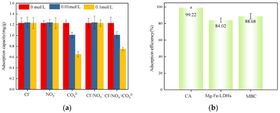 To systematically evaluate the selective phosphate removal capability of CA under environmentally relevant conditions, competitive adsorption experiments were conducted using phosphate solutions (7.5 mg·L−1 as PO43−) containing individual competing anions at two concentration levels (0.01 M and 0.1 M). The selected anions—NO3−, Cl−, and CO32−—represent common inorganic species in natural waters and wastewater. All experiments were performed under optimal conditions (pH 6.0, adsorbent dosage 4 g·L−1, contact time 180 min, 25 °C) to isolate the effects of competing anions.