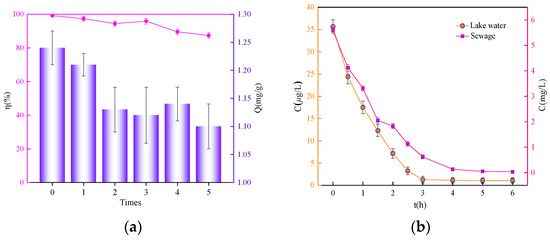 The practical utility of CA was assessed through repeated adsorption-desorption cycles and real water matrix testing. Sequential regeneration using 1.0 M NaOH/Na2CO3 solution maintained robust performance over five cycles, with phosphate removal efficiency decreasing only moderately from 99.22% to 87.83% (Figure 9a). This minimal capacity loss suggests strong structural stability and reversible binding mechanisms, essential attributes for sustainable water treatment applications. To validate environmental applicability, we evaluated CA performance in both lake water (35.62 μg·L−1 PO43−) and municipal wastewater (5.68 mg·L−1 PO43−). Rapid phosphate sequestration kinetics were observed in both matrices, reaching equilibrium within 4 h (Figure 9b). The composite achieved exceptional removal efficiencies of 97.02% and 99.46% for lake and wastewater samples, respectively, despite the presence of complex matrix components and varying initial phosphate concentrations. These results demonstrate the robust performance of CA under real environmental conditions, suggesting its potential for practical phosphate remediation applications (Table S5).