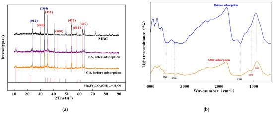 (a) XRD patterns of MBC, CA, and the standard card of Mg6Fe2CO3(OH)16·4H2O; (b) FT-IR spectra of CA before and after phosphate adsorption; (c) magnetic characterization of CA; (d) zero potential characterization of CA.