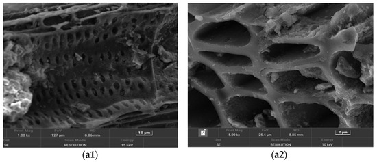 Mulberry branches (Morus alba L.) were collected from sericulture farms in Jiangsu Province, China, washed with deionized water, and oven-dried at 80 °C for 48 h. The biomass was pyrolyzed in a tube furnace (OTF-1200X, MTI Corporation, Richmond, CA, USA) under an N2 atmosphere (99.999%) at 600 °C (heating rate: 10 °C/min, dwell time: 2 h) to produce raw biochar (BC). Magnetic biochar (MBC) was synthesized via co-precipitation: BC (5 g) was dispersed in 200 mL deionized water containing FeCl3·6H2O (3.24 g) and FeCl2·4H2O (1.19 g) (molar ratio Fe3+:Fe2+ = 2:1), stirred for 1 h, followed by NaOH (1 M) addition to pH 10. The suspension was aged at 80 °C for 6 h, magnetically separated, and freeze-dried.
