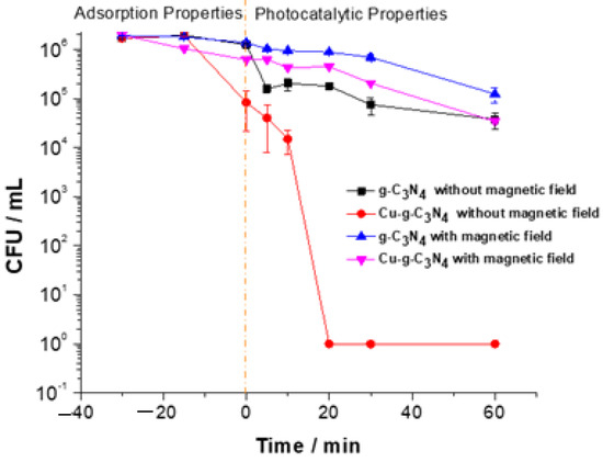 To assess the impact of the magnetic field on the efficiency of the photo-disinfectant material against gram-negative bacteria, an experiment was conducted using Cu-g-C3N4 (previously synthesized [4]) to target E. coli, both in the presence and absence of a 2000 mT magnetic field. As illustrated in Figure 1, the procedure included a 30-min period to establish adsorption equilibrium, followed by 60 min of exposure to a Xenon lamp. The unmodified carbon nitride demonstrated minimal disinfectant activity under visible light irradiation due to its absorption at 465 nm. Consequently, further experiments focused exclusively on copper-doped carbon nitride to gain deeper insights into the notable effects of the magnetic field on the material’s photoactivation.