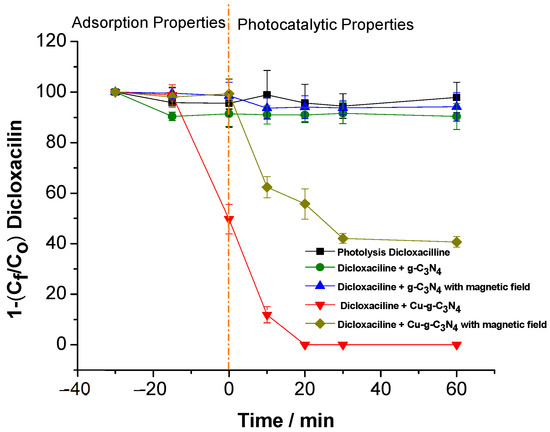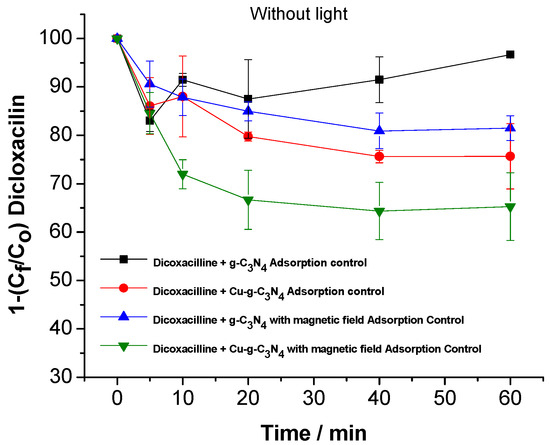 To gain deeper insight into the impact of the magnetic field on photodegradation, an adsorption experiment was performed to evaluate the interaction of dicloxacillin with the photocatalytic material, both in the presence and absence of a magnetic field. The objective was to determine whether the magnetic field influences the drug’s adsorption onto the material’s surface, which could affect its availability for photodegradation and, consequently, the overall efficiency of the process (Figure 4).