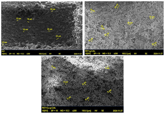 The SEM image of PET reveals a uniform surface morphology with an average particle size of approximately 15 μm, indicating a basic capacity for interaction with nitride materials. In contrast, the SEM image of g-C3N4-coated PET displays a significant increase in surface roughness and potential particle aggregation, with an average size of around 27 μm. These clusters contribute to an expanded surface area, enhancing drug adsorption.