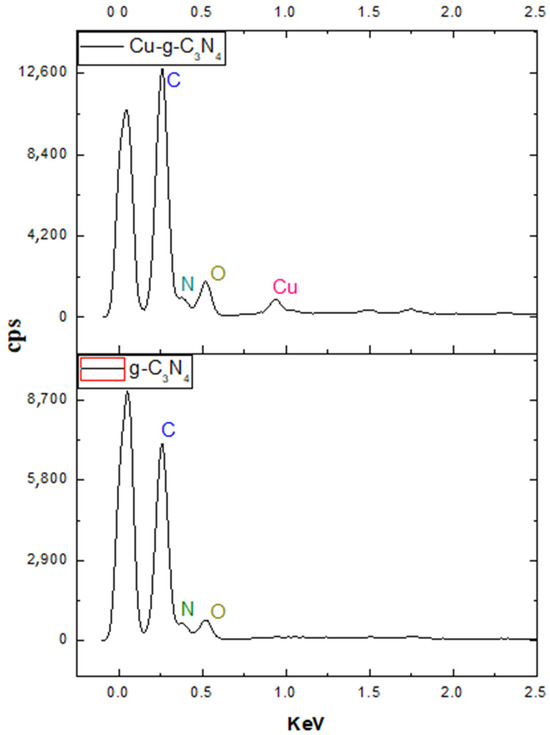 The EDS results show the distribution of elements such as carbon, nitrogen, and oxygen as the main components of the material. However, one of the most prominent results from the analysis is the low copper content detected in the Cu-modified sample, with only 3% reported. This percentage does not entirely represent the actual amount of metal present in the sample. However, this discrepancy could be due to the uneven distribution of copper on the surface, as Cu2+ commonly forms coordination bonds with nitrogen atoms on the nitride’s periphery [4], Table 1, Figure 6.