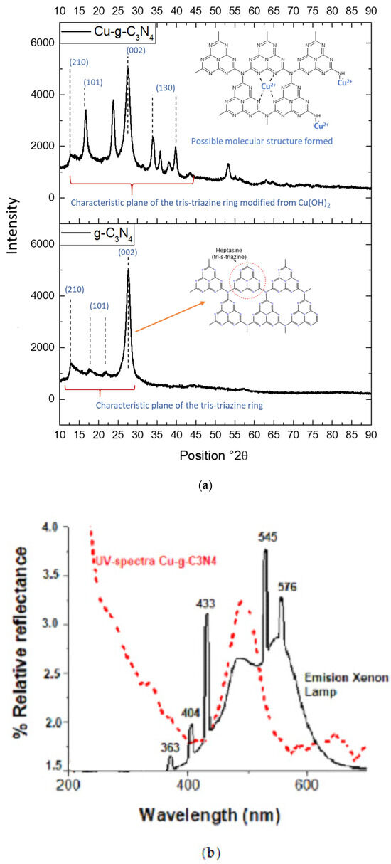 Figure 7a illustrates the XRD analysis results, which were conducted to examine the structural modifications resulting from the incorporation of Cu2+ into the g-C3N4 network and to identify potential changes in the material’s structural arrangement. This analysis provides evidence of the dopant’s interaction with the polymeric matrix and enables the assessment of its impact on the nitride structure. These findings offer valuable insights into how these structural alterations may affect the material’s photocatalytic performance. Figure 7b shows the solid-state electronic spectrum of Cu-g-C3N4. This spectrum confirms the material’s absorption in the visible region and demonstrates how the spectrum of the lamp used for the photocatalysis process coincides with the material’s analysis region, allowing for optimal photocatalytic conditions.