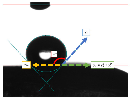 To evaluate the interaction between the liquid and the surface of the material under different conditions, the mathematical expression of Young–Dupré (Equation (1)) and Owens–Wendt (Equation (2)) was utilized, which relates the work of adhesion to the contact angle and the surface tension of the liquid. This analysis enables the decomposition of the Gibbs free energy of adsorption into dispersive and polar components, providing key insights into the forces governing the photocatalytic activity of the material.