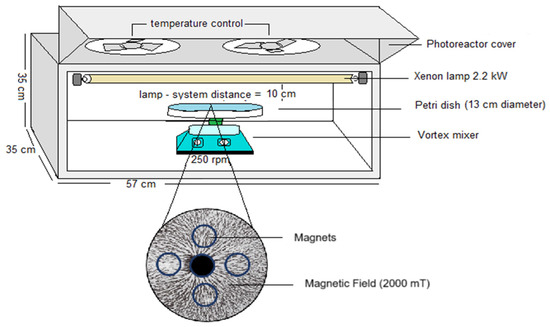 To establish the contribution of the magnetic field in the photo-disinfection process, an aluminum photoreaction system equipped with temperature control composed of 2.2 kW Xenon lamps (Sylvania FT5T8 8500 K 40 cm length, Medellín, Colombia) that emitted wavelengths between 400 and 700 nm to 60 W of light power and two vortex systems equipped with a Petri dish were used. This system allows for a high interaction with light and materials. Between the vortex and the Petri dish were installed four magnets generating a magnetic field of 2000 milliTesla (mT). These values are related to the work conducted by Farhan et al., where they experimented with the use of different magnetic fields for the disinfection of pathogenic bacteria in water and found that the most efficient is 1900 mT [9]. The system is shown in Figure 9.
