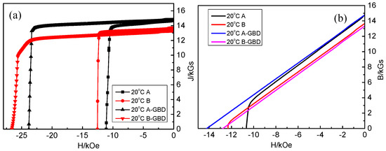 Figure 1 demonstrates the demagnetization curves of the two types of magnets at 20 °C before and after the diffusion treatment. The magnetic properties of the magnets are listed in Table 2. Compared with magnet A (with a coercivity of 11.10 kOe), magnet B exhibits a higher coercivity (12.54 kOe), and due to the addition of Ho, the remanence decreases from 14.82 kGs to 13.66 kGs. This indicates that the addition of Ho can improve the coercivity of the magnet, but there will be a certain loss of remanence simultaneously, which is similar to the cases of adding Tb and Dy [8]. After the grain boundary diffusion treatment of Tb with the same weight gain ratio, the coercivity of magnet A-GBD increases from 11.10 kOe to 23.82 kOe, while the coercivity of magnet B-GBD increases from 12.54 kOe to 26.61 kOe. As shown in Figure 1a, it is evident that the B-GBD magnet has a higher coercivity and a larger increment in coercivity compared with the A-GBD magnet.