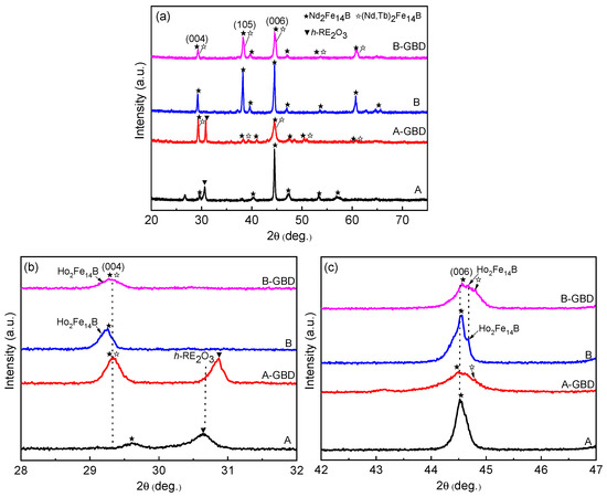The magnified patterns within the ranges of (b) 28–32° and (c) 42–47° are presented in Figure 3b,c. From Figure 3b, it is evident that samples A and A- GBD exhibit a prominent diffraction peak at around 31°. By referring to the data in reference [21], it is hypothesized that this peak corresponds to the (101) plane of hexagonal RE2O3 (h-RE2O3). When compared with the two original magnets, the (006) diffraction peaks of the magnets following the diffusion treatment display a slight shift towards larger angles (Figure 3c). According to the Bragg equation 2dsinθ = nλ [22], the shift of the diffraction peak toward a higher angle implies a reduction in the crystal plane spacing. This phenomenon is attributed to the partial substitution of Nd elements by Tb elements in the epitaxial layer of the main phase, thereby forming the (Tb, Nd)2Fe14B phases. Given that the atomic radius of Tb (0.177 nm) is smaller than that of Nd (0.181 nm), the lattice constant and crystal plane spacing decrease after the substitution, consequently causing the diffraction peak shift. As depicted in Figure 3c, a satellite peak emerges adjacent to the (006) diffraction peaks of the B and B-GBD magnets. This peak corresponds to the same crystal plane of Ho2Fe14B, signifying that the addition of Ho as a raw material gives rise to a new 2:14:1 phase. Additionally, the signal of Ho2Fe14B can also be detected at the (004) position of the B and B-GBD magnets, which leads to the shift of the (004) peak toward the lower-angle direction.