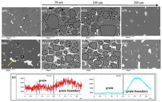 Figure 4 illustrates the cross-sectional BSE-SEM images of the sintered magnets and the diffused magnets at varying depths (specifically, 50 μm, 100 μm, and 300 μm beneath the diffusion surfaces). Figure 4(a0) reveals that the grain size of the Ho-free sintered magnet is relatively coarse and inconsistent. There are numerous abnormally large grains, and the distribution of the grain boundaries appears indistinct. Upon the addition of Ho, as is evident from Figure 4(b0), the grain size of the main phase diminishes. The main grains are uniform in size, and their boundaries are distinct, resulting in a rather ideal microstructure. Figure 4c displays the line scanning results of magnet B. As shown in Figure 4c, Ho is distributed both within the grains of the main phase and at the grain boundaries. In magnet B, the concentration of Ho inside the matrix grains is lower than that at the grain boundaries.