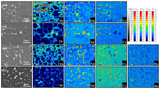 The addition of Ho can enhance the coercivity but decrease the Curie temperature [6]. It has been reported that Co can replace Fe in the lattice of the main phase to form Nd2Co14B, which can significantly increase the Curie temperature of the main phase. Some research indicates that substituting 1 at.% of Fe in the magnet’s composition with Co can increase the magnet’s Tc by approximately 11 K [26]. Therefore, 2.5 wt.% of Co was added to the B magnet, while the Co content in the A magnet is 1.5 wt.%. As shown in Figure 6(b1,b2), Co tends to distribute at the grain boundaries in the A-GBD and B-GBD magnets, and the distribution of Co elements in the B-GBD magnet is more dispersed than that in the A-GBD magnet, which is similar to the distribution of Nd.